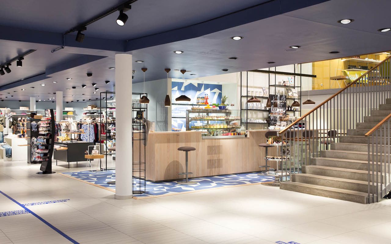 Die charakterstarken blauweissen Fliesen weisen den Besuchern bereits von Weitem auf die willkommene Erfrischungsmöglichkeit hin. Um einen großzügigen Bar Tresen aus Eschen Holz, hinter der frontalen Verkleidung und dem kernigen Barbrett, fügen sich professionelle Gastro Kühl- und Thekenelemente aus Edelstahl aneinander. Ein überdimensional hohes Ladenbau Regal bietet ausreichend Platz für Geschirr und Gläser, zugleich können Produkte zum Verkauf präsentiert werden, wie z.B. Kaffee, Schokoladen und Pralinen aus regionalen Schwarzwald Produktionen.