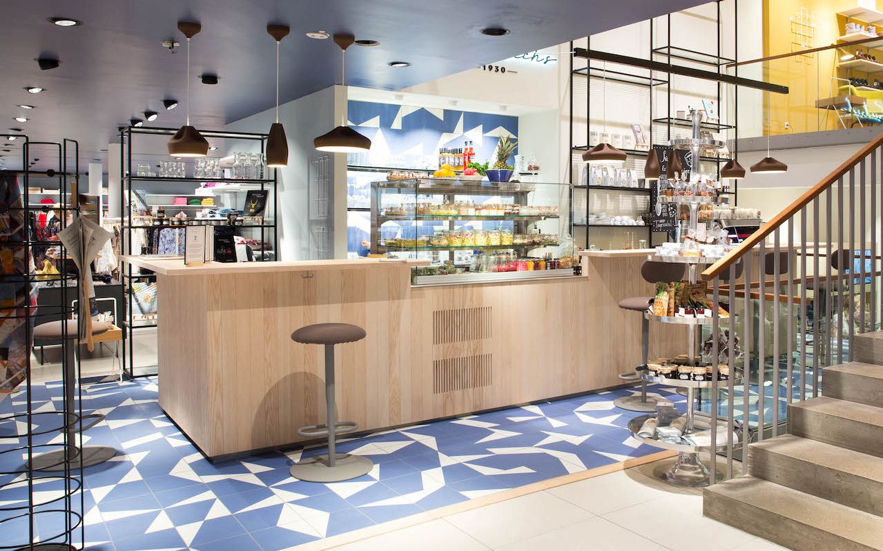 An der Theke werden herrlich frische kleine feine Köstlichkeiten in einer Glasvitrine angeboten, die auf blauweissem Vintage Geschirr dem Kunden ausgegeben werden. Komfortable Sitzgelegenheiten gibt es zahlreich am Tresen und auf gepolsterten Stuhlsesseln mit niederen Tischen.