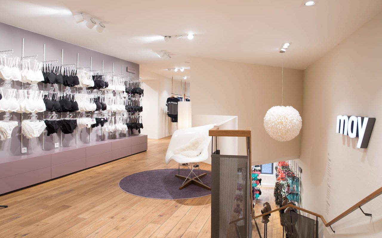 Das Modehaus May präsentiert verschiedenste Modegenres und Modethemen inklusive Schuhen und Accessoires in mehreren miteinander verbundenen Häusern. Hier galt es zusammen mit einem Team von May und dem Visual Merchandiser Lars Friedrich von Hachmeister + Partner, Bielefeld die unterschiedlichen Stilrichtungen herauszuarbeiten. Ebenso sollte auf die architektonischen Besonderheiten eingegangen werden. Realisiert werden sollte ein Modehaus für Kunden und Mitarbeiter ansprechend, einladend und mit hoher Aufenthaltsqualität.