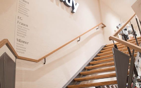 Dazu gliederte Nathalie Vogelbacher Innenarchitektur in Workshops mit den Auftraggebern das Warenkonzept in Zonen- und Themenbereiche. Geplant wurden zwei großzügige Etagen deren unterschiedliche Angebotsausrichtungen mit einem klaren Material- und Farbkonzept unterstrichen werden: im Eingangsbereich wird dem Besucher die junge trendige Mode in einem durchweg farbenfrohen Ambiente präsentiert. Zur Ausstattung der neuen Etage für die klassische und elegante Damenmode wurden hochwertige textile Wandbeläge und ein klassisches Farbkonzept in Champagner- und Bordeauxtönen ausformuliert. Diese Farbenwelt setzt sich im Ladenbau für die Warenpräsentationen, die Umkleidebereiche und Sitzgruppen fort. In der Männerwelt sind Wandbeläge in dunklen Tönen und Eichenholz vorherrschend.